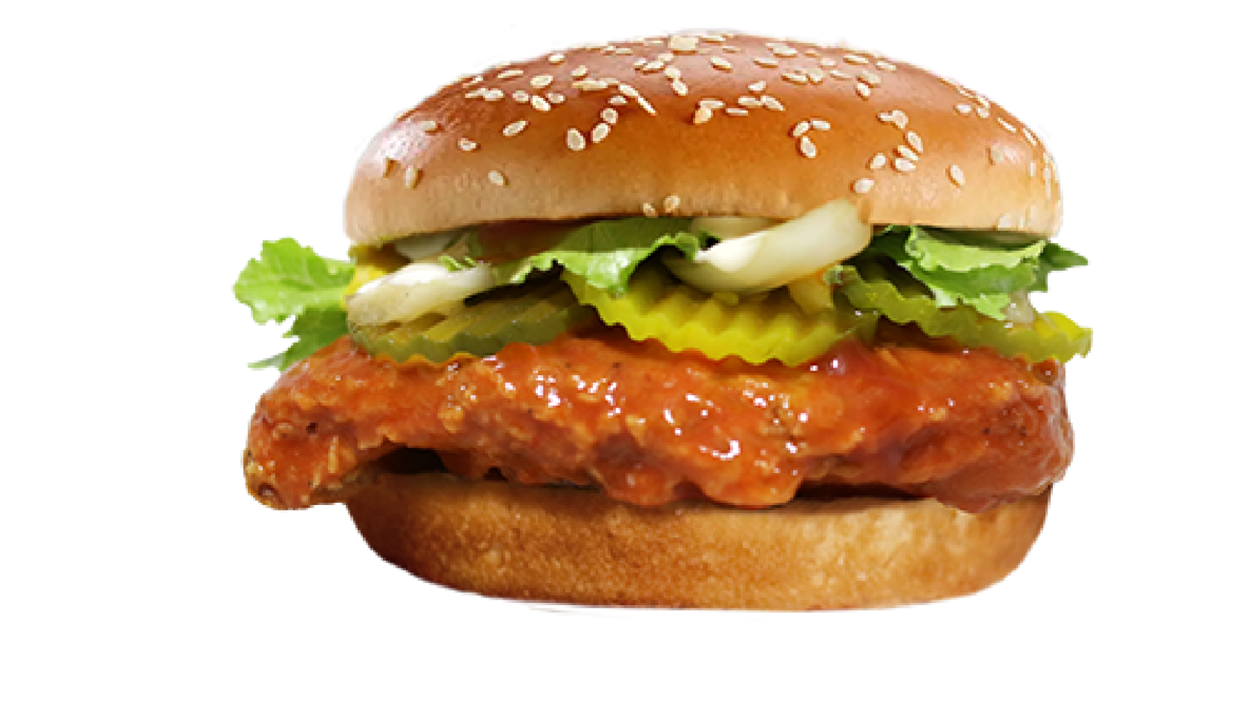 100% pechuga de pollo empanizada Spicy bañada en salsa búfalo, cebollita asada, pepinillo, lechuga, mayonesa, mostaza y cátsup.